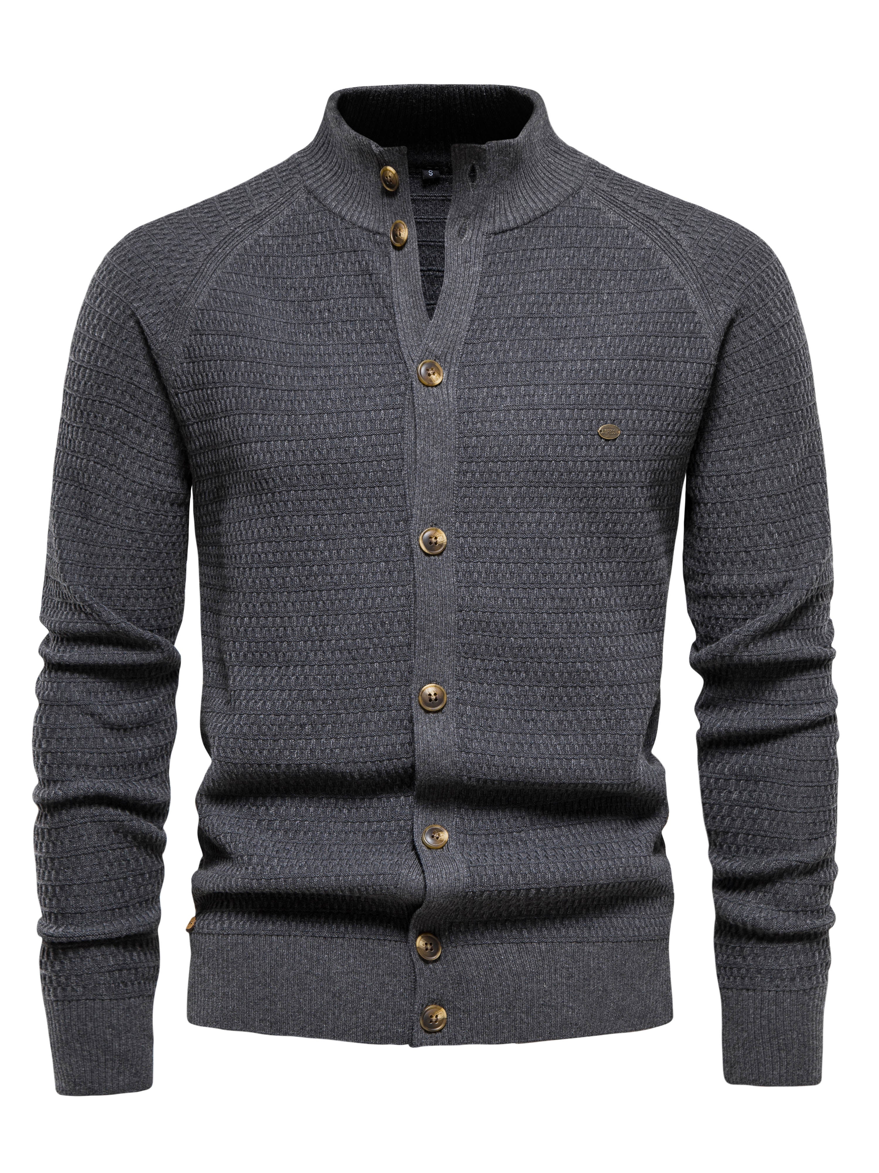 This sophisticated cardigan is designed for the modern man who values both style and comfort. Featuring a chic mandarin collar and a buttoned front, it seamlessly blends classic elegance with contemporary flair. Perfect for a variety of occasions, from casual outings to cozy evenings at home, this luxurious knit ensures you stay warm without sacrificing style. Crafted from a comfortable fiber blend, it offers a relaxed fit that complements your everyday look.