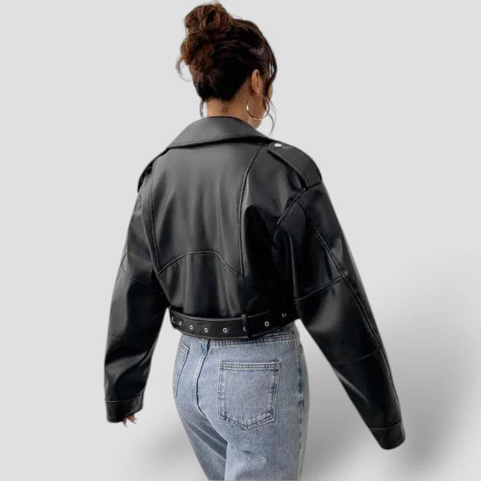 Step into style with the Women's Leather Biker Jacket featuring eye-catching zipper details.