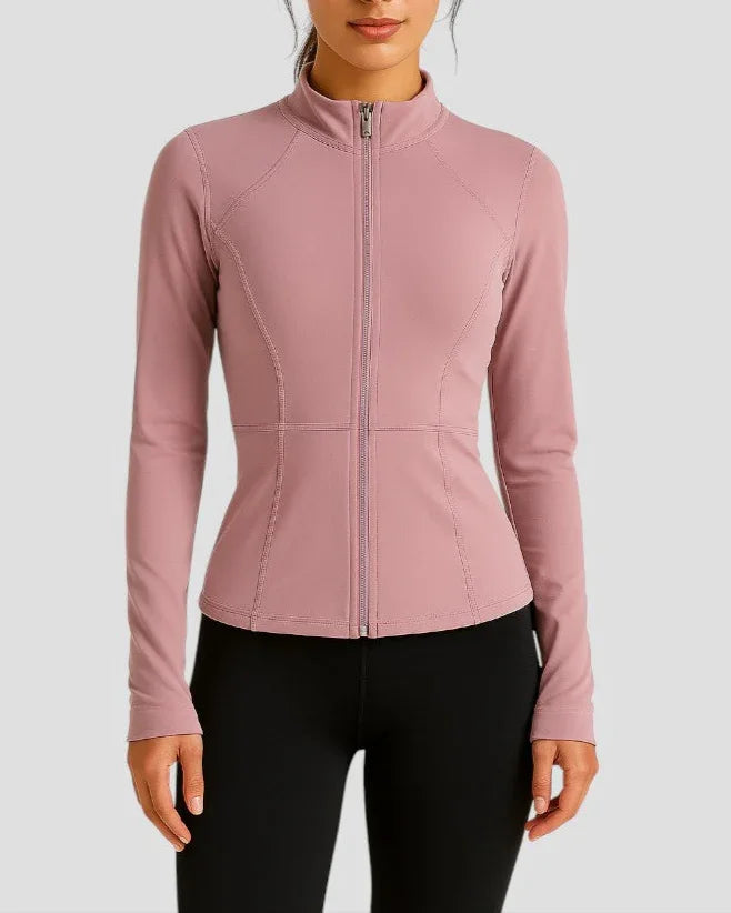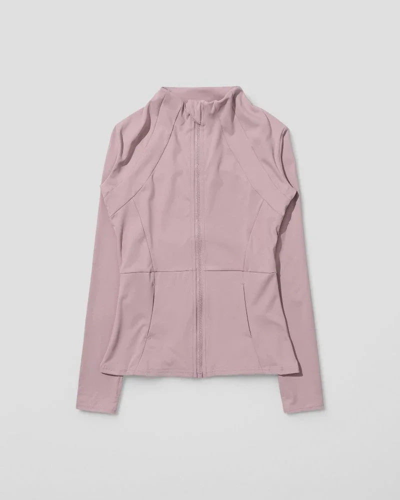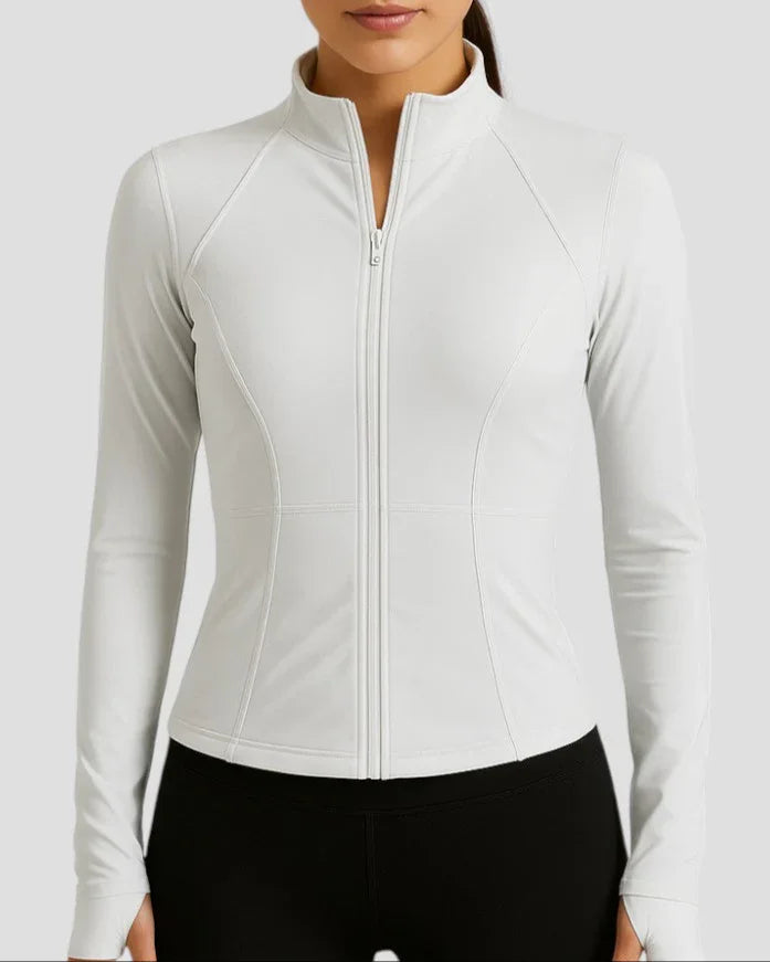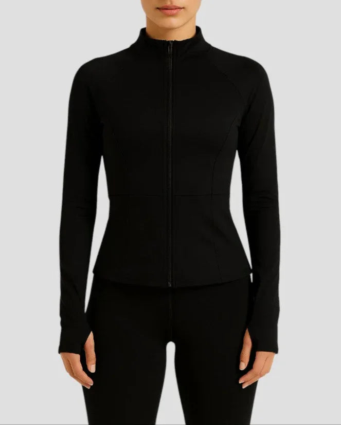 This versatile jacket is perfect for any occasion, whether you're hitting the gym, enjoying a morning stroll, or layering up for a casual outing. Crafted from lightweight stretch fabric, it offers exceptional flexibility and comfort, allowing you to move freely during workouts or everyday activities. The breathable and quick-drying material ensures you stay cool and dry, making it an ideal choice for intense training sessions or yoga classes. With a flattering fitted shape and streamlined zip closure, this jacket enhances your silhouette while providing a polished look. The thumbhole cuffs and high collar add extra coverage and style, seamlessly transitioning from fitness to fashion.